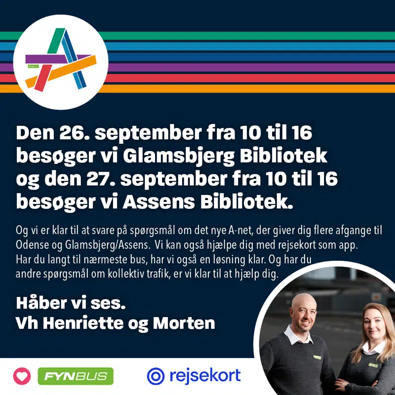 I denne uge besøger FynBus Assens Kommune, hvor du kan tale med dem om det nye A-net, rejsekortet som app, og hvilke muligheder du har for plusture og fleksture, hvis du har langt til nærmeste bus.